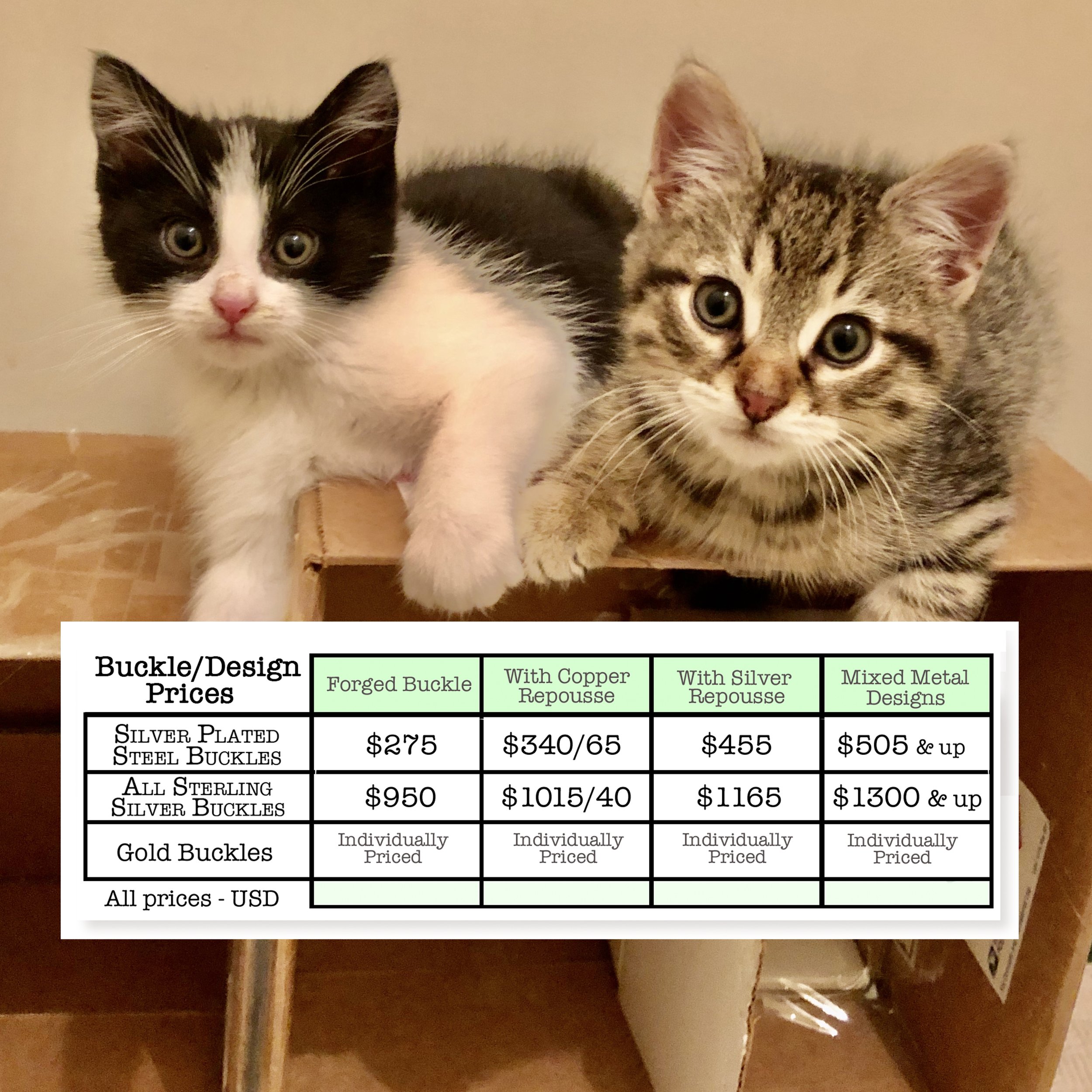 If the buckle is made of silver plated steel - that’s one price range. If the buckle is made of solid sterling silver - that’s another price range. In the grid, The Buckle is the left column.
